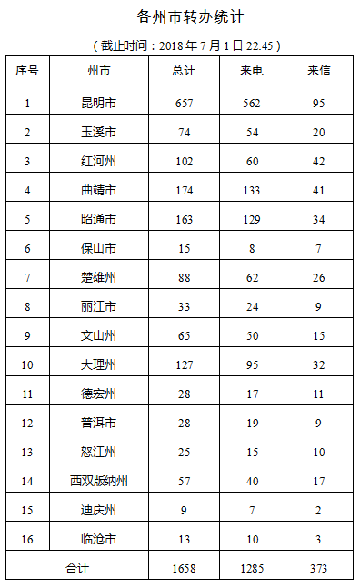 截止目前共计接收到中央第六环保督察组二十七批次共计1658件交办件,其中来电举报1285件,来信举报373件,涉及16个州(市),昆明657件居第一位;曲靖174件居第二位;昭通163件居第三位;大理127件居第四位;红河102件居第五位,涉及重点关注案件499件。
