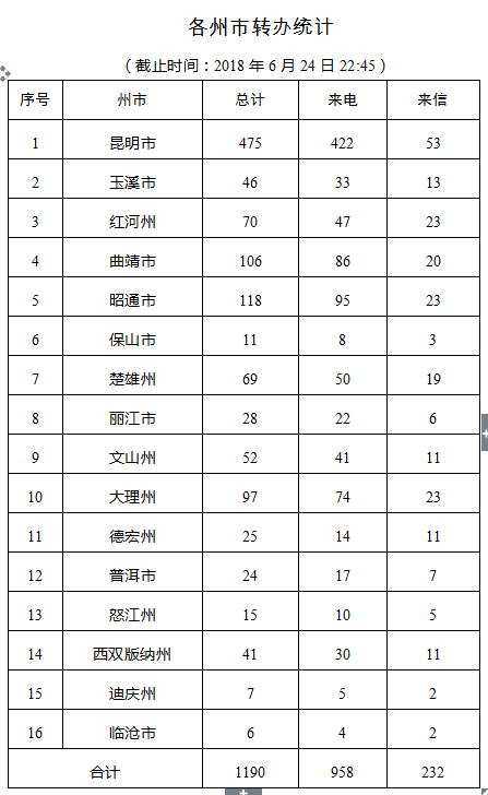 截止目前共计接收到中央第六环保督察组二十批次共计1190件交办件,其中来电举报958件,来信举报232件,涉及16个州(市),重点关注案件385件。