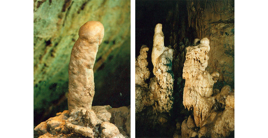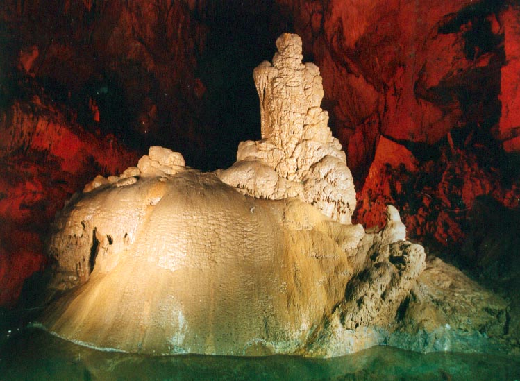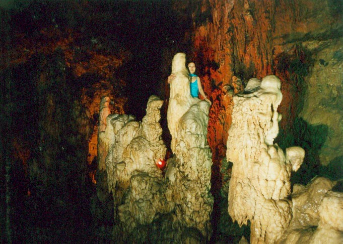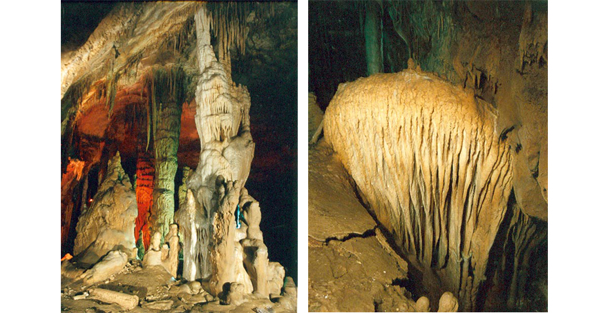 弯腰爬入洞中,面前豁然开朗,大厅中环立石乳、石枝、石柱。攀援而上,一路峰回路转,景象奇特,石人、石猴、石龙、石狮、石花绚丽多姿。石瀑临空飞溅,气势磅礴。一石柱顶天立地,腰围13.5米。倒锥状钟乳悬空高吊,雕梁画栋般的石笋、石柱拔地而起,弯管状钟乳枝攀壁叠晶,“嘀嗒”滴下的甘泉沁人心脾。淡红色丛状、羽状石柱布满洞顶,如串串熟透的小米,洞底灰黄色石灰华堆积,如倒置金钟、垂莲、华盖。石柱厅两棵高25米、直径1.5米的巨大石柱上下相连,如一对永不分离的情侣正海誓山盟。洞顶、洞壁、洞底缠绕的羽状、枝状、柱状钟乳石,如盘根错节的热带雨林。上尖下圆巨柱,如呼削而起的导弹,正飞向浩瀚的宇宙。一大厅几棵粗壮石柱上下错位公,看似危机四伏,实则安如泰山。