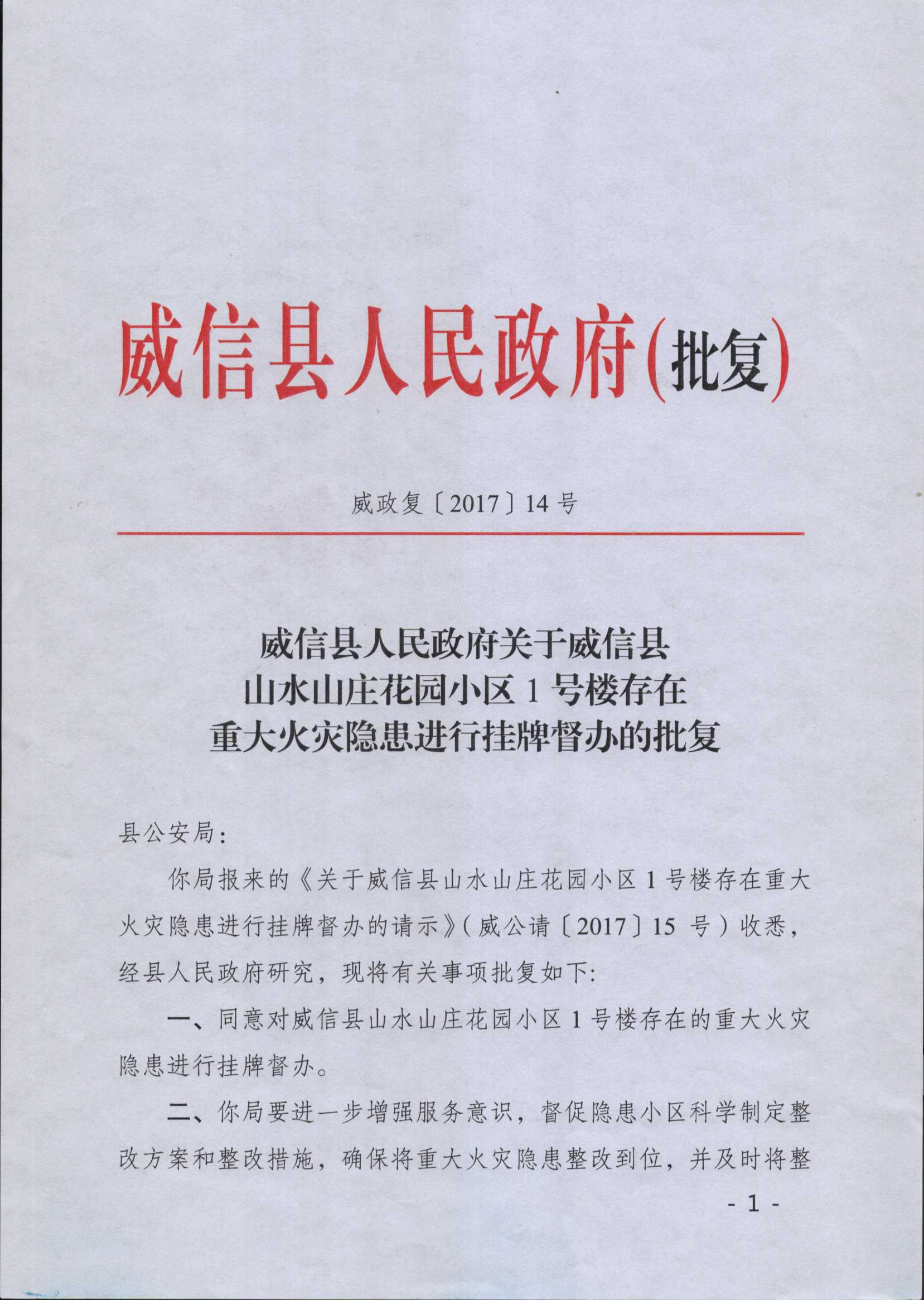 根据《重大火灾隐患判定方法》(GA653—2006),以上火灾隐患已达到重大火灾隐患界定标准,构成重大火灾隐患。为了加大对重大火灾隐患的督促整改力度,保证重大火灾隐患按时整改完毕。按照《中华人民共和国消防法》第五十五条的规定,经大队集体研究,特报请威信县公安局提请县人民政府对威信县山水山庄花园小区1号楼存在的重大火灾隐患进行挂牌督办。